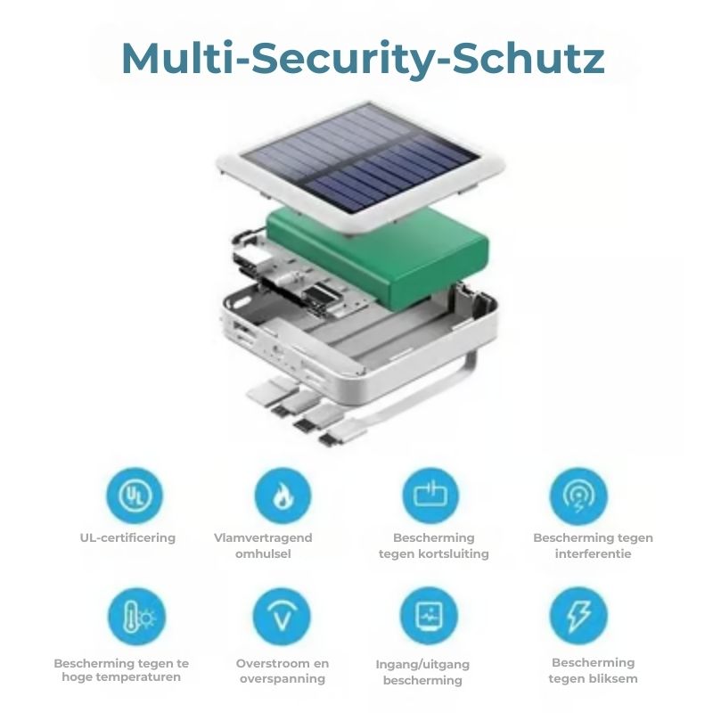 Deze op zonne-energie aangedreven powerbank wordt geleverd met vier kabels, een LED zaklamp en een polsband.